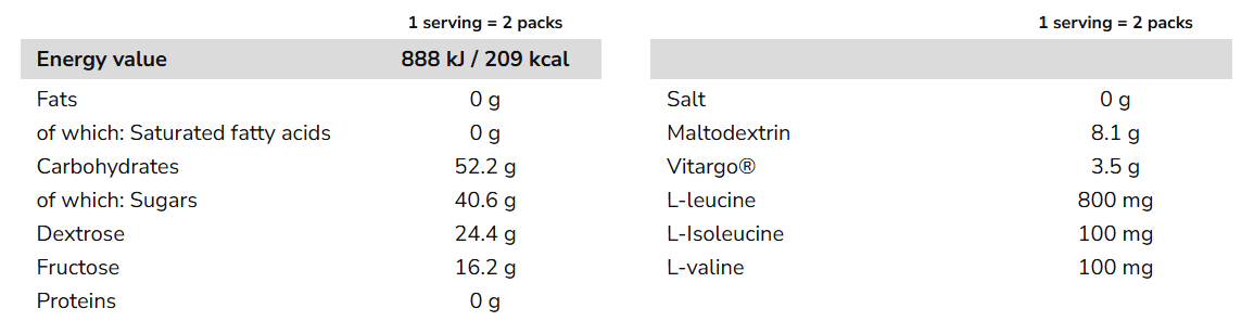 - Maltodextrin and Vitargo® (amylopectin from corn) → Sustained and slow-release source of energy.