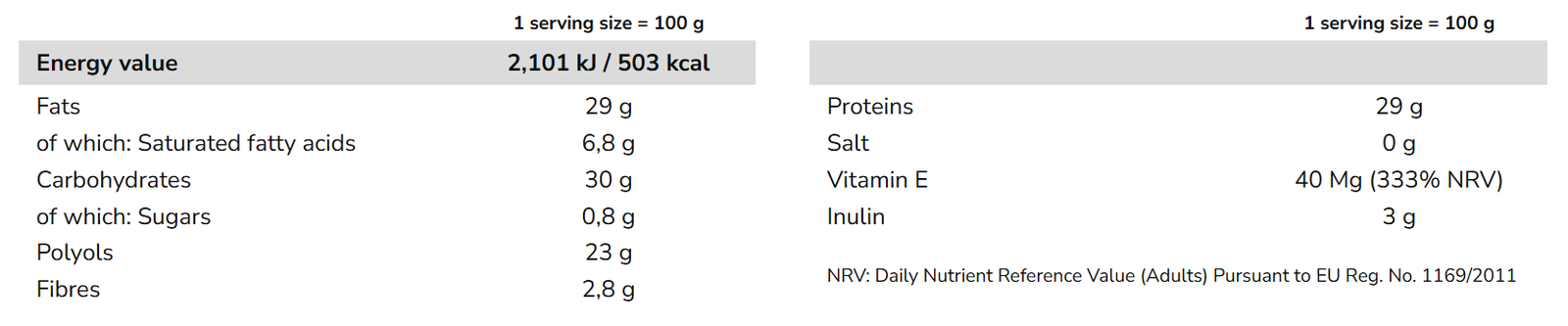Spreadable cream with hazelnuts, whey proteins, vitamin E and inulin.