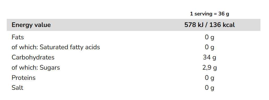 Fast and long-lasting source of energy: the O.D. 19 value guarantees a faster energy release than maltodextrin with low O.D., supporting endurance performance and intense efforts.