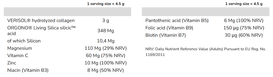 Food supplement based on VERISOL*® (type I and III collagen peptides), ORGONO® Living Silica** (silicic acid), magnesium, vitamin C, zinc and B vitamins.