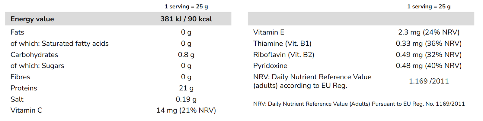 - Egg White Protein Isolate (EGGXELLENT®): Provides essential amino acids with a profile similar to that of human protein, ideal for muscle maintenance and growth.